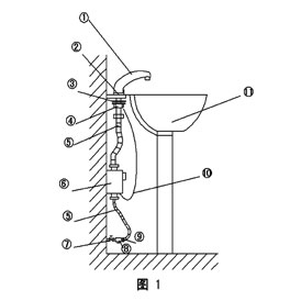 ⑴水龙头 ⑵装饰板 ⑶大胶垫 ⑷螺 母 ⑸软 管 ⑹控制盒 ⑺截止阀 ⑻过滤器 ⑼对 丝(15mm)⑽信号线 ⑾面 盆